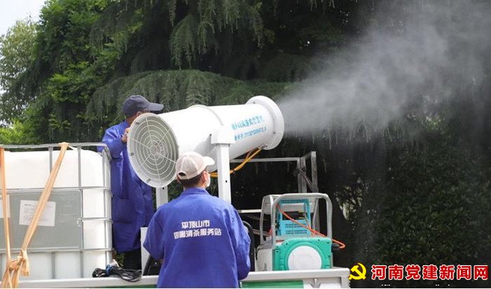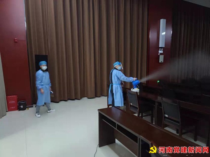 河南党建新闻网讯(李万全通讯员柳真真)5月9日,宝丰县委、县政府南北办公区,一辆满载84消毒液的喷洒车正在进行喷洒作业,多名室内外保洁人员手拿喷壶、肩背喷雾器正在进行补充消杀……综合办公楼二楼、政务中心一楼、政务中心会议室、机关餐厅等重要场所设立多个值班岗位,严格执行进入区域扫场所码的防疫要求,织密疫情防控防护网。