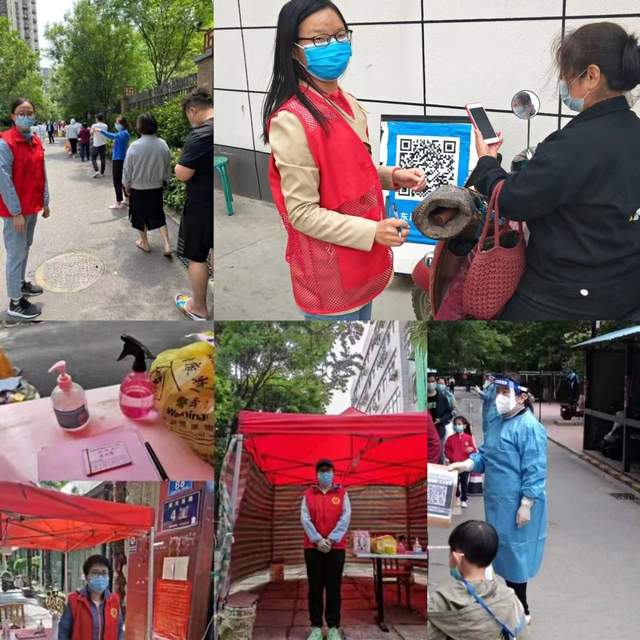 郑州七中党员教师赵京辉、闫培逢、李阳、李莉、张丽丽、梁岩在社区做志愿者,负责扫码测温等工作