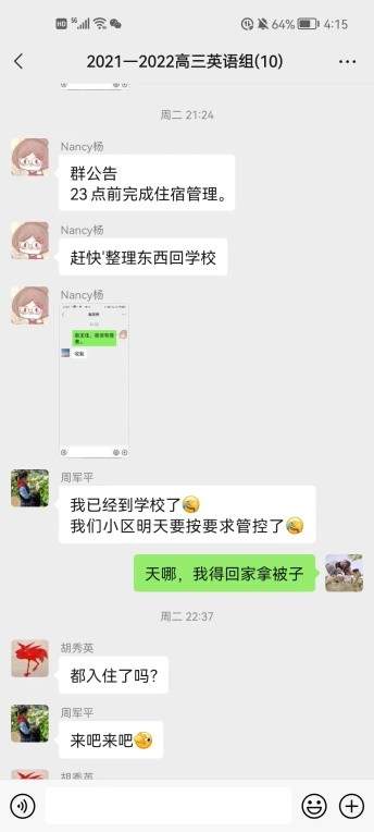 其实,当核酸检测和学校封控指令下达,杨少华老师和同组的其他老师们都是毫无怨言背着被褥和洗漱用品在规定的夜里十一点之前从四面八方赶到各自的位置。无人居住的房间,满是尘埃,他们没有怨言,而是彼此相助,友爱鼓励,共同营造战斗的团队,向上的情谊,为学生心甘情愿,为师的纯粹和担当。当晚杨老师和其他老师一样由于事发突然一夜无眠,辗转反侧,可是早上的早读和课堂,她依然振作精神,学生们学习的劲头离不开杨老师等的留校老师的热爱学生的深情付出。