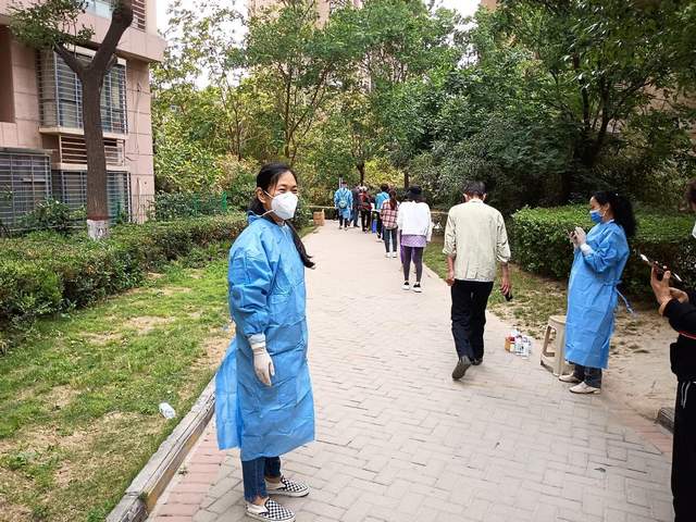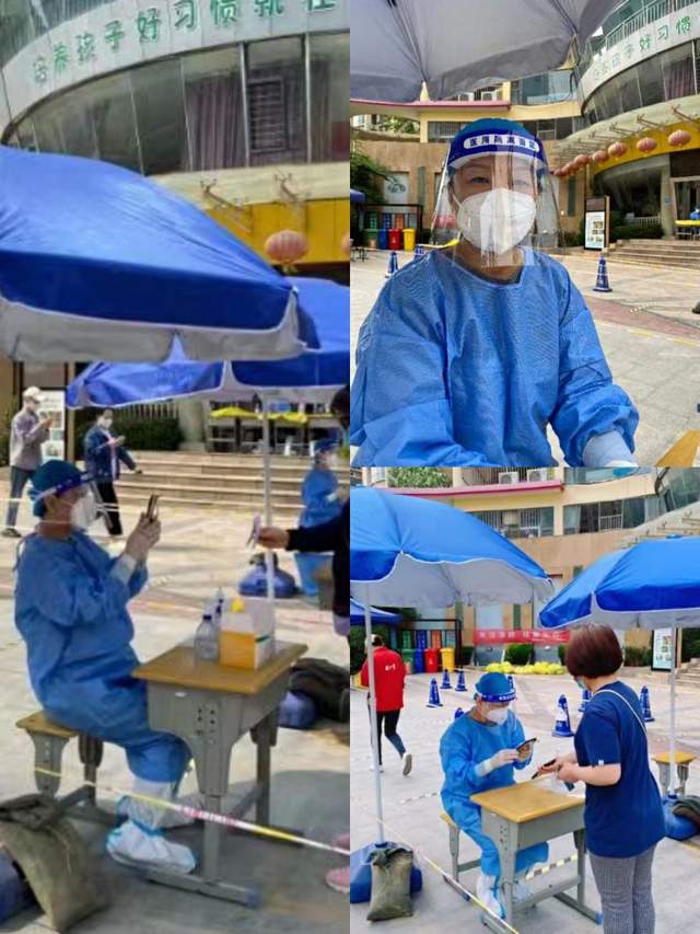 5月5日上午郑州七中党员教师时莹莹、赵新芳在金水区东岸尚景小区开展核酸检测志愿服务。