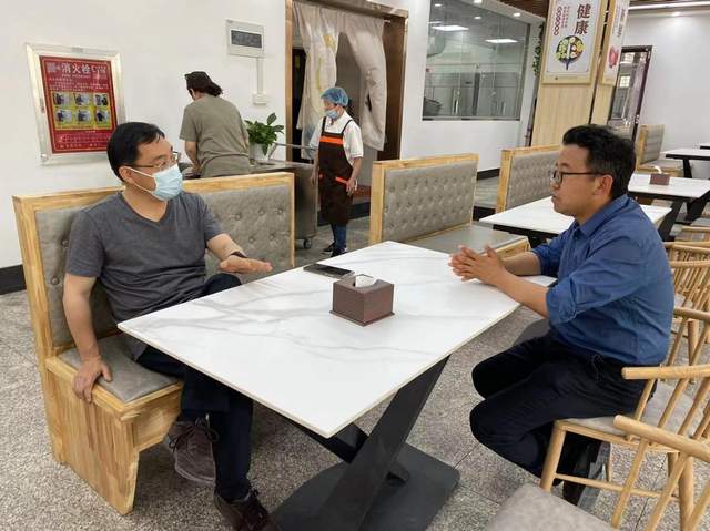 王保军校长封校期间与高三学生同吃同住,在餐厅询问高三年级主任,了解关爱学生食宿、学习、心理等情况