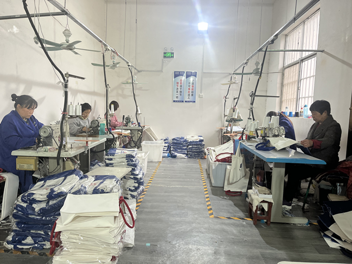 河南党建网讯:5月15日上午,在宝丰县闹店镇周营村美雅包装有限公司,伴随着缝纫机有节奏的响声,二十余名工人在各自岗位上有条不紊地忙碌着,经过分切、印刷、缝纫等数道工序,一件件精致的布包逐渐成型。