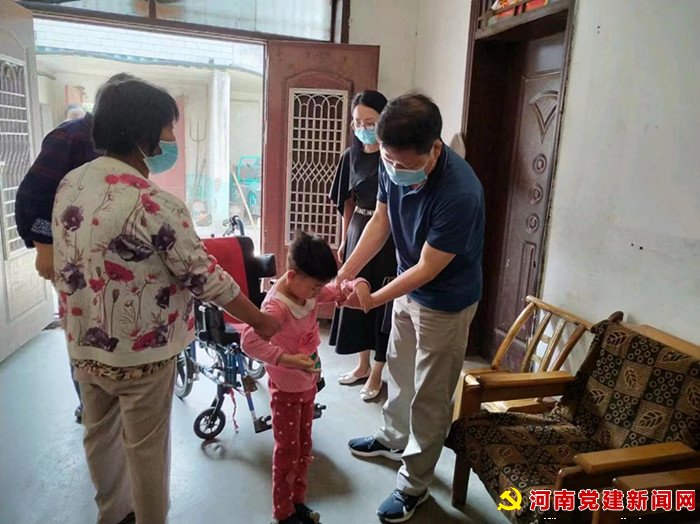 河南党建网讯(李万全 李河新 史书盈)“让孩子多锻炼,需要我们帮助尽管说。”5月20日,在残疾人户陈国迎家,平顶山市残联康复部部长薛政国拉着肢体残的孩子圆圆,观察其恢复情况,并建议其监护人多让圆圆练习走动。