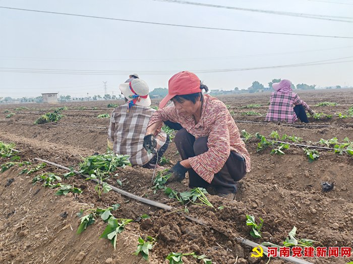 河南党建网讯:时下,正值红薯栽种的黄金时节,宝丰县周庄镇西黄村红薯苗栽种工作已全面展开。5月24日上午,走进红薯种植基地,工人们沿着早已翻好的土垄有序开展工作,插苗、覆土……田间地头一派繁忙景象,一垄垄栽种的错落有致的红薯苗与忙碌在田间地头的工人们,构成了一幅生机勃勃的农忙花卷。