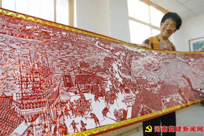 这卷长11.05米、宽0.5米的《清明上河图》,是宝丰县73岁的剪纸艺人孙花叶的杰作。她遵照原作,用红色镭射纸,采用套剪、连剪、分剪3种技法,剪刀、裁刀等4种刀具耗时2年完成,现收藏于保护发展中心。