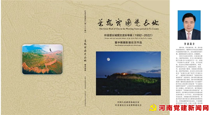 河南党建网讯 (李万全 马文忠 王少军 刘锰洋) 日前,在国家文旅部将叶县楚长城列入长城国家文化公园建设重点工程,国家文物局将叶县楚长城公布为第一批重点保护段点的历史契机,叶县政协领导高度重视历史文化,出版《叶县战国楚长城》一书。本专辑由董中锋著、叶县政协文史委编辑出版。