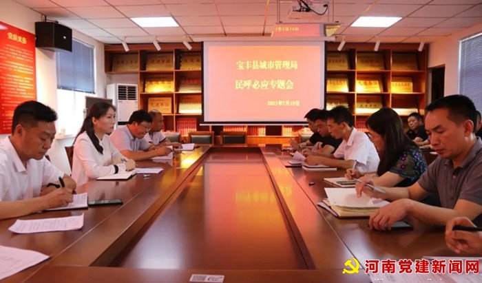 河南党建网讯(李万全通讯员 赵晓丹)7月19日下午,宝丰县城市管理局“民呼必应”专题会在三楼党员第一活动室召开。会议由党组书记、局长肖晓培主持,班子成员及中层干部参加。