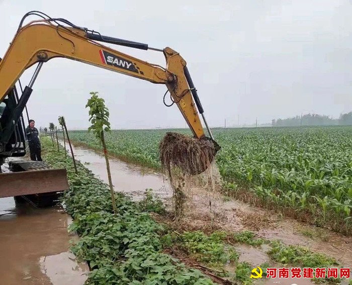 河南党建网讯( 通讯员柳真真 窦传阳)7月21日,雨点密布,在宝丰县石桥镇邢庄村,“党员先锋队”正在指挥着机械,疏通三支渠,确保洪水安全过境。