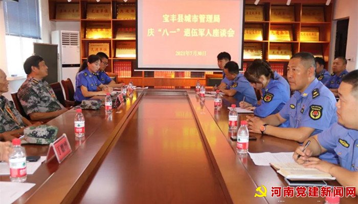 河南党建网讯(李万全 通讯员赵晓丹)为庆祝建军94周年,搭建与退役军人沟通交流平台,7月30日上午,宝丰县城市管理局召开迎“八一”退役军人座谈会,县城市管理局30多名退伍军人代表欢聚一堂,回忆军旅生涯,共话城市管理事业。朱洼村党支部书记、退伍军人模范代表张同键,县退役军人事务局党组成员、民兵训练基地主任丁耀增,县城市管理局党组书记、局长肖晓培,县城市管理局党组成员、副局长何保山以及退役军人代表30余人参加座谈会。会议由县城市管理局党组成员、副局长胡永辉主持。