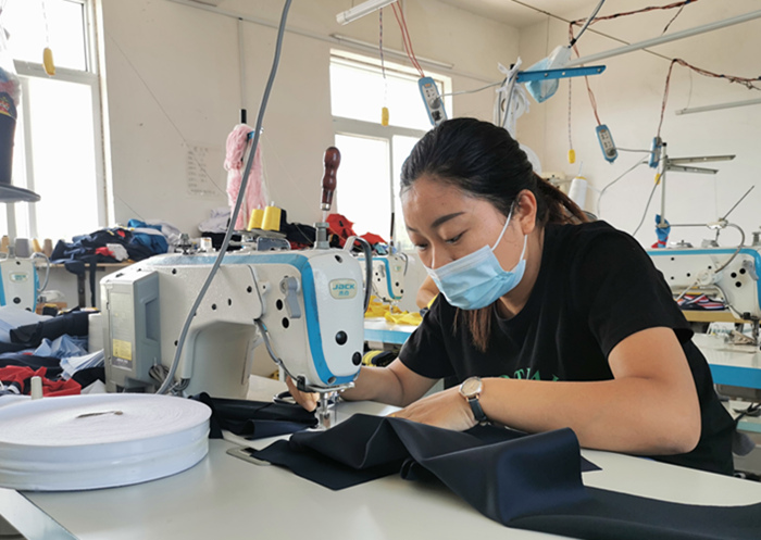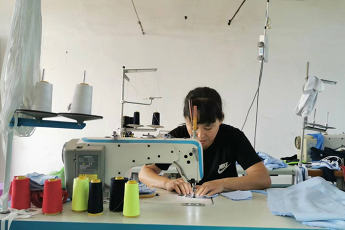 “我是姚店铺村的,原来在南方服装厂务工,这两年考虑到家里老人孩子需要照顾,就不再外出务工了,现在在这个厂里做缝纫工,活不算累,一月差不多可以拿到3000多元,最关建是离家近,不耽误照看老人和孩子。”在桐润服装有限公司上班的女工葛盼乐说。