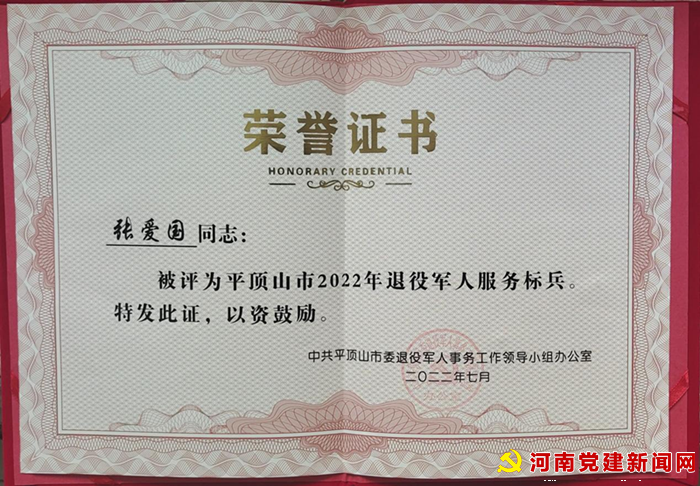 河南党建新闻网讯(李万全黄普鹏)近日,平顶山市举行2022年庆“八一”抗战老兵慰问暨“最美退役军人”表彰大会,郏县广阔天地乡退役军人服务站站长张爱国荣获“退役军人服务标兵”荣誉称号。