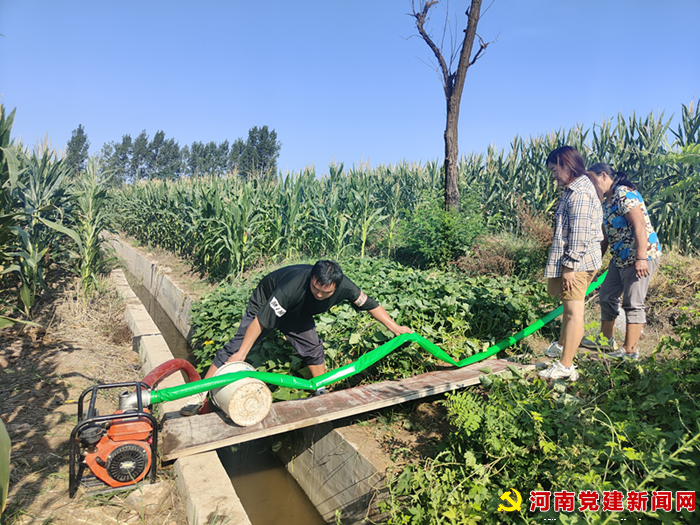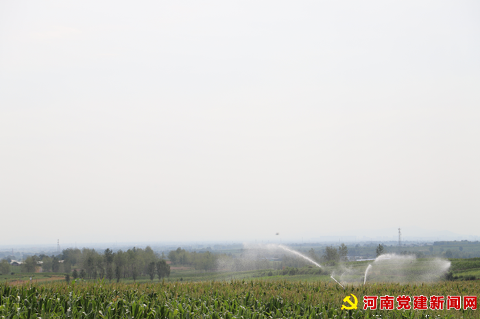 河南党建网讯(李万全 通讯员:陈亚沛)8月23日,在宝丰县大营镇古垛村的西凤凰山上,两架高压水枪正在烈日下进行着360度旋转,喷出的水花犹如哗哗的雨珠,顺着叶子流进土地。原本打卷的玉米叶,在喷灌约一个小时后,枝叶舒展开来,明显有了“精气神”。