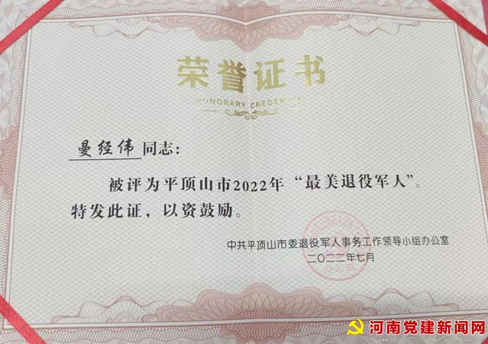 戎装虽脱,军魂尚在。曼经伟带着军人的坚毅在社区工作中敢于拼搏、乐于奉献,凭着一股永不服输、争先创优的韧劲,满腔热血献社区,一心一意为群众。先后荣获了宝丰县“脱贫攻坚百日提升行动五好工作者”、“平顶山市第三次全国农业普查先进个人”、“优秀退役军人”等荣誉。