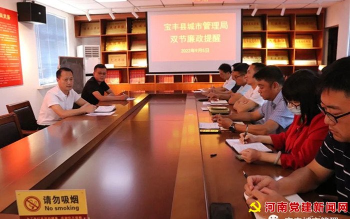 河南党建网讯(李万全通讯员赵晓丹)“双节“将至,为深入贯彻落实全面从严治党要求,进一步加强党风廉政建设,提高干部廉政从业的自律意识,9月5日上午 ,宝丰县城市管理局在三楼会议室召开廉政集体谈话会议,县纪委常委余文峰主持会议,县纪委监委派驻自然资源局纪检组长李树勋出席会议并讲话。局班子成员、机关各中队、股室负责人参加。