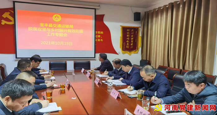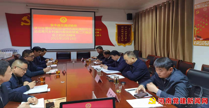 河南党建网讯(李万全通讯员高磊)10月19日,在宝丰县交通运输局三楼会议室由局党组书记、局长董国旗主持召开学习市委、市政府领导在脱贫攻坚成果同乡村振兴有效衔接第二次会议上的讲话精神会议。