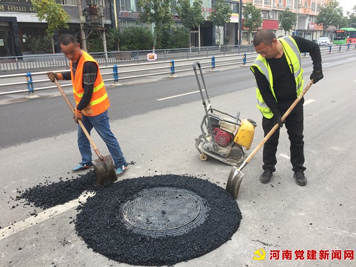 河南党建网讯(李万全通讯员李万鹏 连聪聪)10月26日,在宝丰县君文路上,市政工人用夯实机一点点压实、找平窨井盖井口面层沥青,为该路段安装上新型“五防”井盖。
