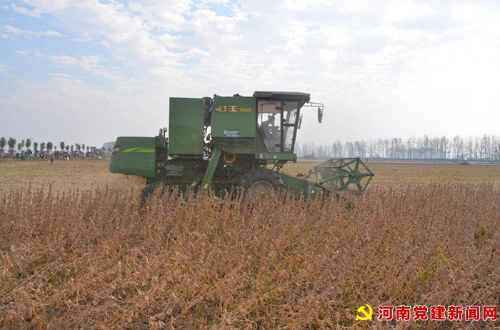 河南党建网讯( 李万全 通讯员柳真真 王向丽)大地撒金黄,地头豆满仓。眼下正是大豆收获的好时节,10月26日上午在宝丰县闹店镇周营村的连片豆田里,一串串沉甸甸的豆荚挂满豆杆,收割机来回穿梭作业,不一会儿就剥离出颗粒饱满的大豆。收获的同时,大豆秸秆就地粉碎撒还农田,成为下一季农作物的肥料。