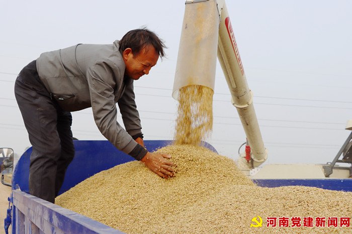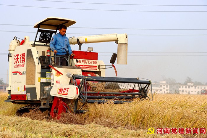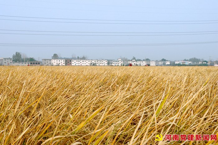 河南党建网讯(李万全通讯员杨国栋 李萍 秦亚涛)11月2日,在宝丰县赵庄镇范庄村土地流转户范跃东的稻田里,收割机来回穿梭,金灿灿的稻粒让范跃东喜笑颜开,50亩黄金晴水稻即将收割完毕,今年又是一个丰收年。