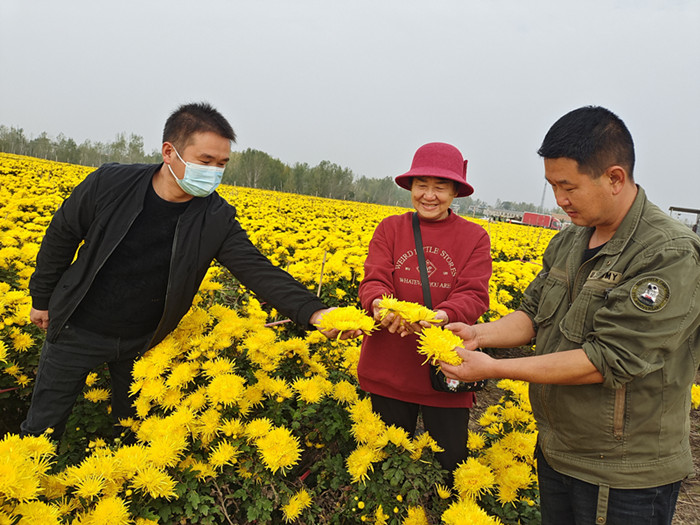目前正值采摘期,村民们正兴高采烈的采摘盛开的金丝皇菊,丰收的喜悦洋溢在脸上。村民们边唱歌边采摘菊花,孙庄村一组村民告诉记者:“今年从春天铺地膜、种苗,夏天除草、打尖到现在采摘她都有来务工,在基地里干活轻松,一天工作8小时,加班另加工资,等这些菊花摘完,今年我应该能拿到10000多元务工收入。采摘菊花是轻活、“开心活”,你看我来采摘菊花心情就会很好,我都是边唱歌边摘菊花。”