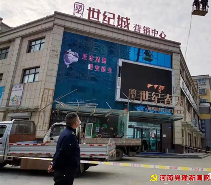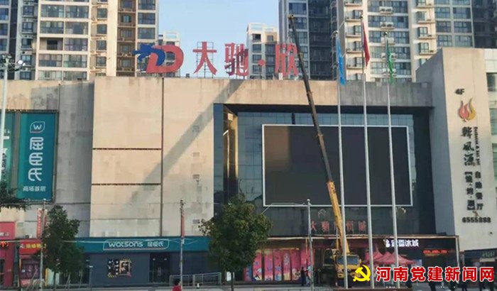 河南党建网讯(李万全通讯员赵晓丹)11月18日早上6点钟,位于城区迎宾大道东段的大驰欣悦城商超外墙,一台大型启重机伸着长长的机械臂高空作业,几名工人手持焊枪正在楼顶切割广告牌的钢架支撑。