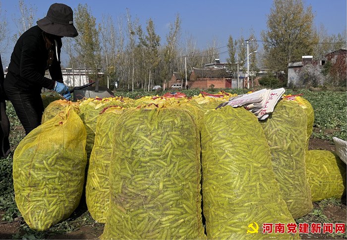 河南党建网讯(李万全通讯员 柳真真 魏嵘凯)11月29日,宝丰县闹店镇范营村的青豌豆地里,连片的豌豆,颗粒饱满、长势喜人,50余名村民们正在进行采摘,绿油油的田里一派繁忙的景象,处处洋溢着丰收的喜悦。