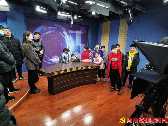 走进县融媒体中心,在工作人员的带领下,孩子们近距离体验了“媒体”的工作环境,先后参观了宝丰县融媒体台史党史馆、视频制作室、融媒体调度指挥中心、宝丰县电台和融媒体演播厅等。在视频制作室,工作人员介绍的新闻发布流程、后期制作和新闻播报等环节,深深吸引了孩子们,他们纷纷好奇地坐在摄像机前体验了一把当“主播”的感觉。