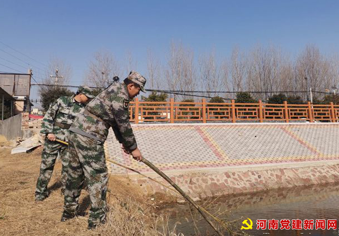 河南党建网讯(李万全 通讯员 柳真真 杨海楠)12月22日,周二一大早,随着宝丰县李庄乡武装部长郑书参一声号令,30余名基干民兵身穿迷彩服,手拿竹竿和铁耙,大家精神饱满,军容严整,动作熟练,对凤鸣湖、运粮河、西外口水库等河段的岸边废弃物、有无排污、倾倒垃圾等现象集中开展巡河和河湖“清四乱”联合行动。