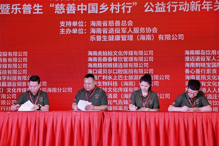 签约仪式上,海南省退役军人服务协会分别与海南省辽宁商会、广西商会等7家商协会,光彩集团、华人卫视海南分公司等8家企业签订战略联盟协议;与乐普生集团、海南明启嘉荣数字科技有限公司达成三方战略合作,标志着社会化拥军格局进一步拓展,将整合政企资源形成服务合力,为退役军人就业创业提供政策支持、资源对接、市场拓展等全链条服务。中视手机台董事长黄裕欢介绍“慈善中国乡村行”公益行动规划,该行动将聚焦乡村振兴与退役军人帮扶,通过公益捐赠、产业对接等方式,助力退役军人在乡村振兴一线建功立业,随后省军协与乐普生集团正式签约,携手开启公益拥军新篇章。当《强军战歌》的旋律响起,全体参会人员齐声合唱,激昂的歌声回荡全场,凝聚起军地同心、共筑梦想的磅礴力量。