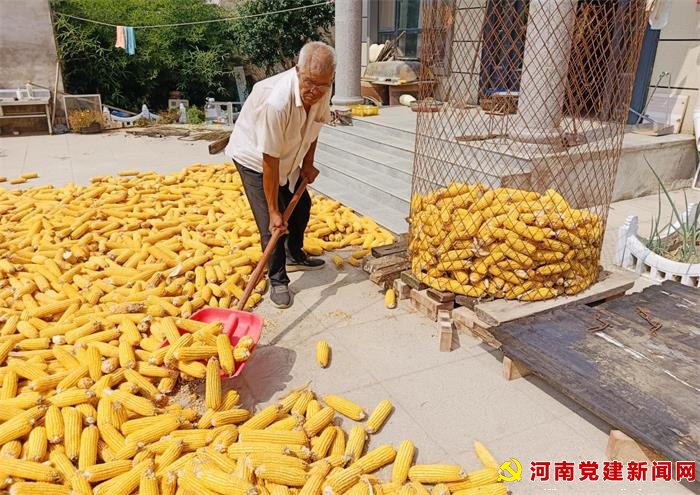 一排排玉米植株连秆带穗被快速卷入收割机中,收割、摘穗、剥皮、入仓、秸秆粉碎还田等作业环节一气呵成。伴随着色泽金黄、籽粒饱满的玉米棒倾泻而出,玉米直接装入农用车中。在王大吴村党支部书记王建民的带领下,村民们走进玉米地里来回穿梭,抢收玉米,田间地头、屋前院内收获的玉米黄灿灿的一片成了时下一幅最亮丽的乡村风景图。