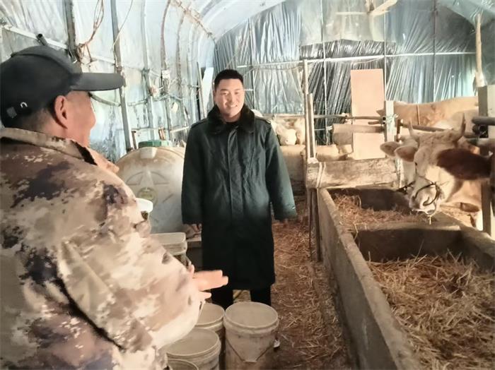 1月20日上午,在养殖户张泽民的养牛大棚里,李河龙详细询问了牛舍保暖和饲料存储情况。张泽民表示,根据政府提前发布的强寒潮预警,他们已及时做好牛舍加固和饲料储备工作。