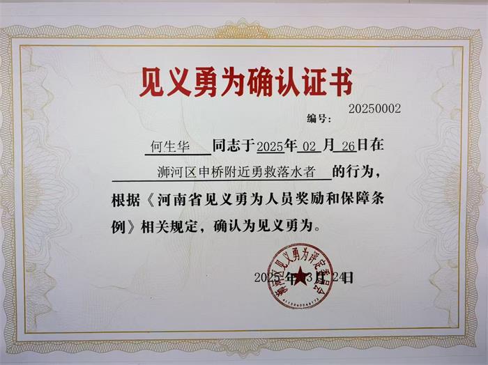 危急时刻显担当!何生华勇救落水者获见义勇为认定