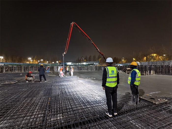 在鹤壁仁康医院项目,为抢在12月11日晚8点大风、雨雪前锋抵达前完成关键楼板浇筑,项目团队倒排工期至小时。混凝土搅拌站提前预热骨料,测温员全程记录,确保入模温度稳定在7℃以上,严格高于5℃的规范要求。经过30余小时连续作业,当最后一车混凝土完成浇筑、保温层随即严密覆盖时,整个工序比天气“窗口期”的安全底线提前了整整7小时。 这宝贵的7小时,为应对任何突发状况留出了充足余地,更彰显了科学组织下的 “从容决胜”。