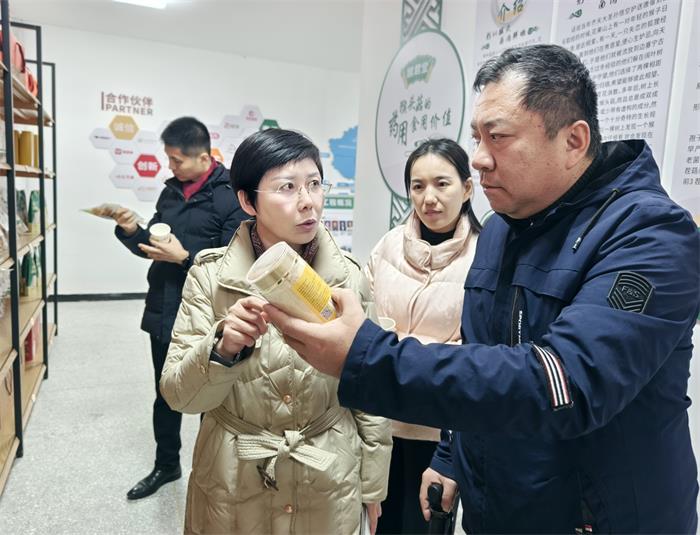 在平甸村,郑州市政协委员、郑州工商联副主席、平甸村驻村第一书记、河南上鼎源生物科技有限公司董事长高凤董事长向调研团详细介绍了企业发展历程与猴头菇产业整体布局。嘉宾们实地参观了产品展示厅,近距离察看清水猴头菇、低糖膳食面等深加工产品的研发流程与生产工艺,认真询问产品质量管控、市场销售渠道及品牌建设等情况。