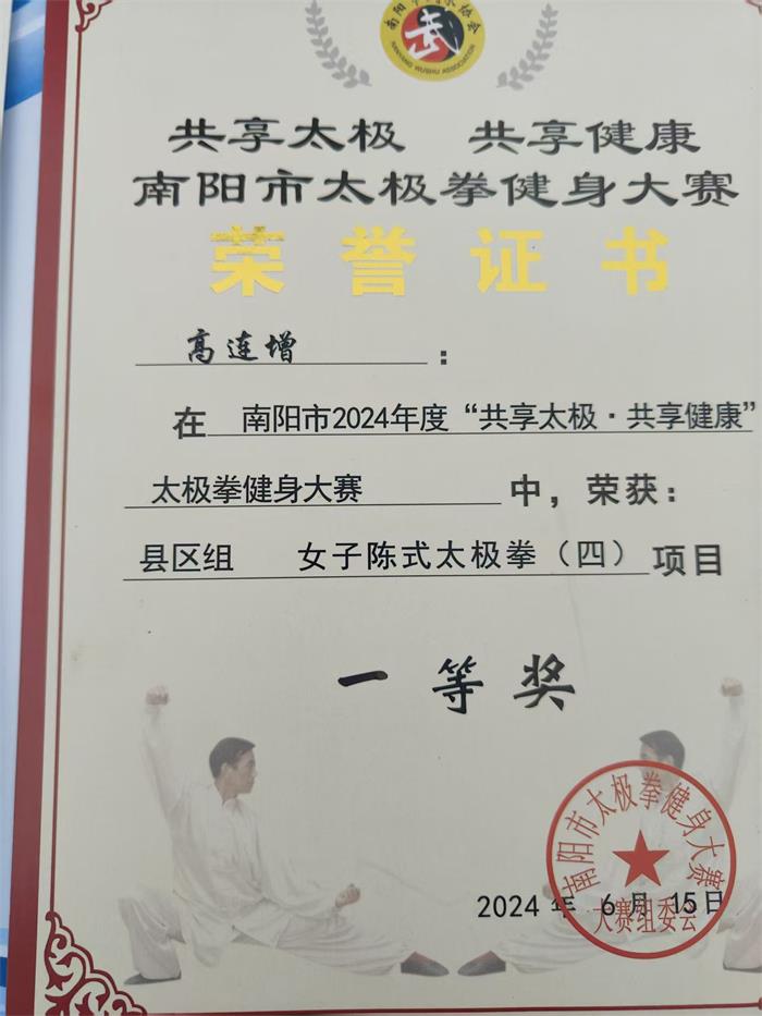 68岁的高连增,是南阳南召县云阳镇街头巷尾人人敬重的太极老师。一袭素衣,一招一式刚柔并济,拳风里藏着数十年的功底;一腔热忱,四十余名徒弟亲授不辍,坚守中透着最纯粹的无私。她不求名利,不图回报,以太极为桥,在云阳的晨光暮色里,把精湛武艺化作温暖力量,让中华传统功夫在乡野间生根发芽,也让老有所为的初心,在一招一式的传承中绽放光彩。在多次比赛中获得奖项,如在2024年第十届澳门国际武术节获得金奖2枚、铜奖1枚,在“”共享太极共享”健康南阳市太极拳健身大赛中荣获一等奖等等。