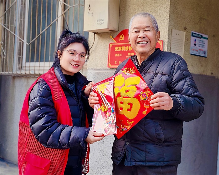 为让组织关怀精准触达,社区党总支还特别组建“党员送福小分队”,开启了一场“靶向式”入户送福的暖心之旅。小分队成员带着精心挑选的春联与福字,走进老党员家中。每到一户,他们都与老党员促膝长谈,细细倾听他们追忆峥嵘岁月、分享入党初心,耐心询问他们的身体状况、生活需求与实际困难,将党组织的牵挂与新春问候一一送到心坎上。“这春联真好,感谢党组织一直惦记着我们这些老党员,心里真是暖!”老党员李国栋手捧红彤彤的春联,脸上洋溢着幸福的笑容,眼中闪烁着感动的泪光,紧紧握着工作人员的手再三道谢。