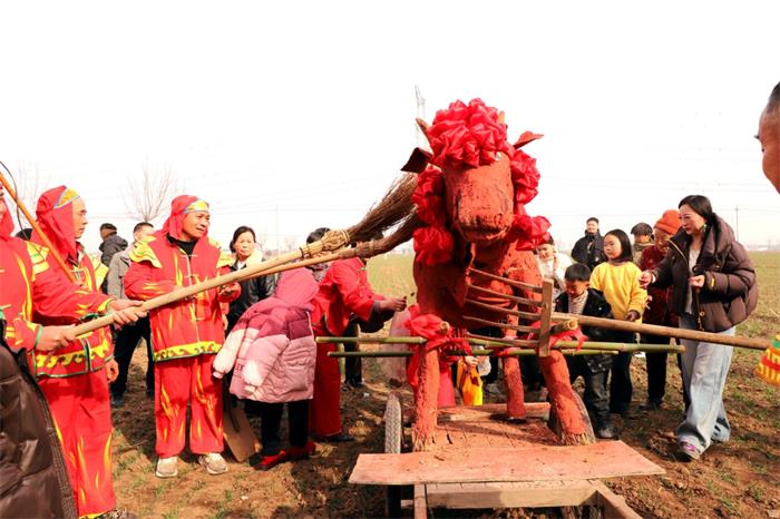 “打春牛”现场,头戴红花的红 “土牛”站在麦田的平板车上,一位村民扬鞭打春牛,并口中唱道:“第一鞭:鞭打春牛头,米面满仓缸满油;第二鞭:鞭打春牛背,家业兴旺人富贵;第三鞭:鞭打春牛尾,日进斗金赛春水……”与此同时,围拢在 “春牛”边的其他村民手持木锨、扫帚、桑杈、掠筢等农具,向“土牛”身上打去。被打碎的“土牛”肚里装的五谷杂粮流出。围观群众纷纷上前抢拾流到地上的谷物和土块,把土块撒进耕田和牲畜圈舍,促进谷物牲畜繁殖,期待有好收成。