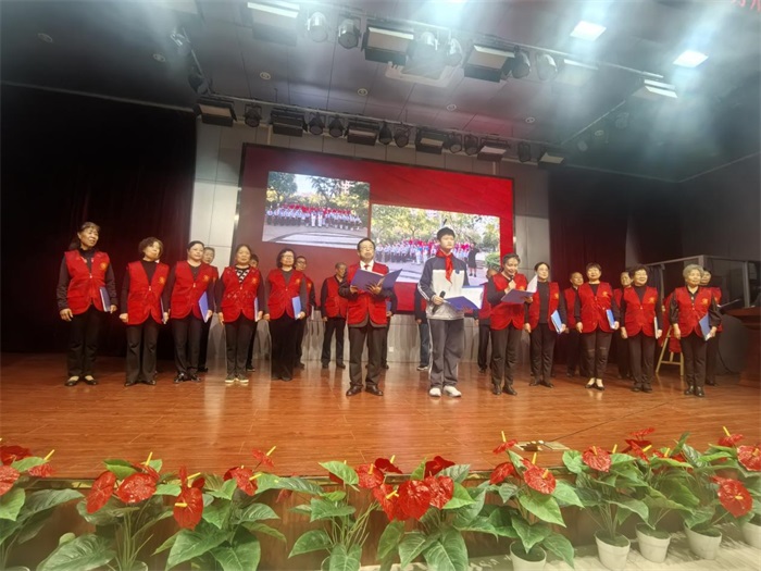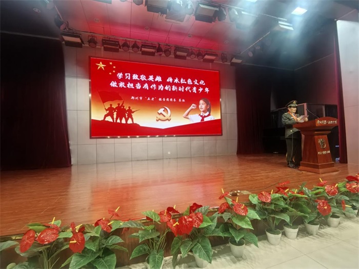 在随后的环节中,七年级学生带来了激情澎湃的经典诵读《少年中国说》,展现了青少年的蓬勃朝气和爱国情怀。“五老”志愿者与学生代表共同表演的集体诗朗诵《接班人之歌》更是将现场气氛推向高潮。郑州市关工委“五老”报告团团长蔡耘老师分享了亲身经历的军旅战斗故事,让在场的师生深受感动。“五老”志愿者黄素珍老师深情朗诵了红色家书,传递了革命先辈对后代的殷切期望。